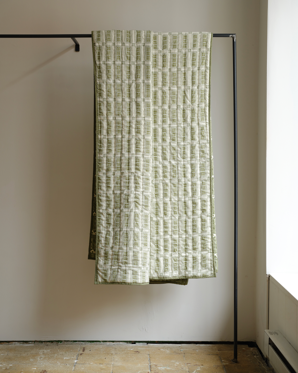 Oversized reversible quilt, made by hand over many months, consists of block-printed percale cotton and natural cotton fill. Each quilt is hand-stitched using a traditional unknotted running-stitch technique. King / Queen (one size) 100% percale cotton, stitched with cotton thread. Dry clean only.